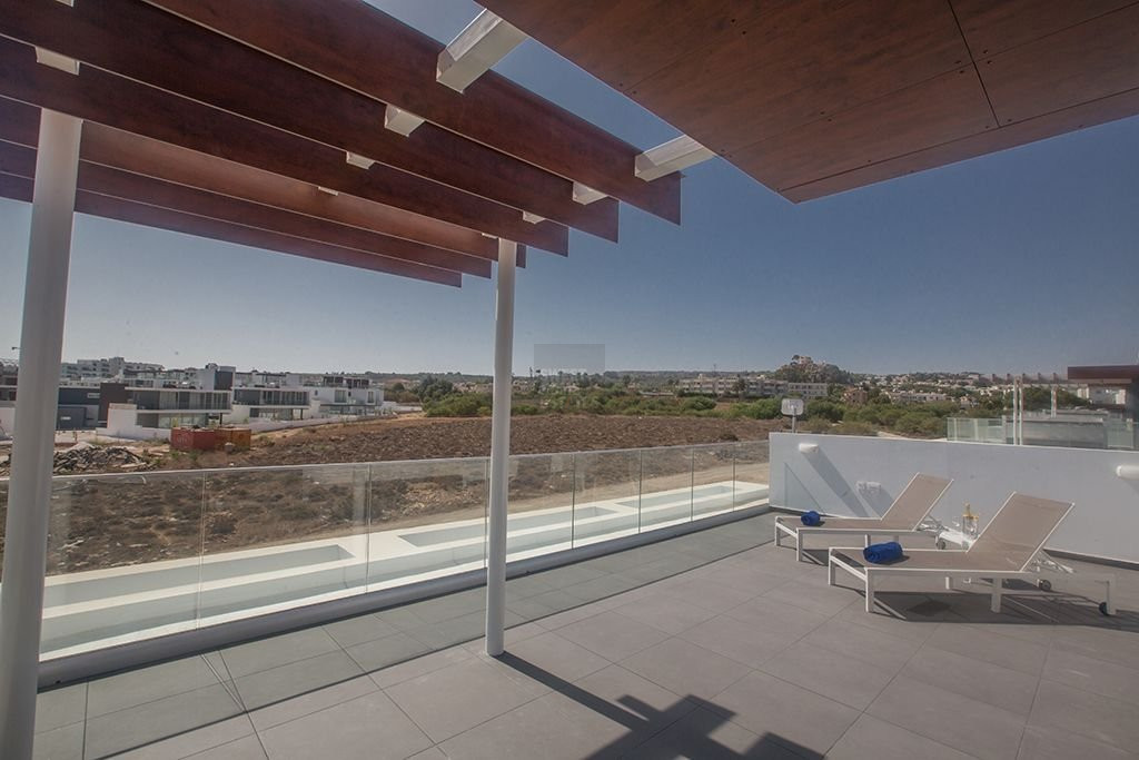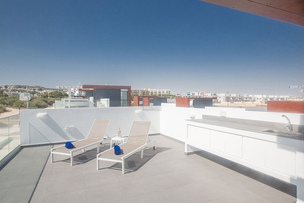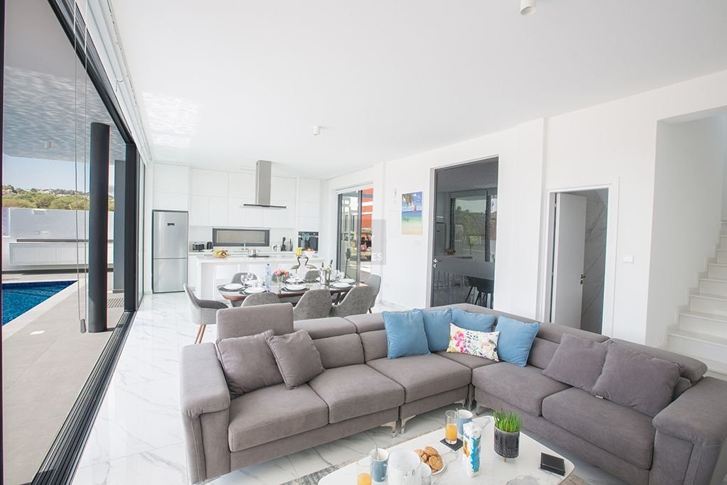 The villa consists of three spacious bedrooms, with fitted wardrobes, a master ensuite, a balcony with fantastic views, and a large family bathroom. Downstairs there is a chic and stylish kitchen and dining area and a bright, spacious, and welcoming living room with plenty of large windows leading you outdoors to the sunny terrace.