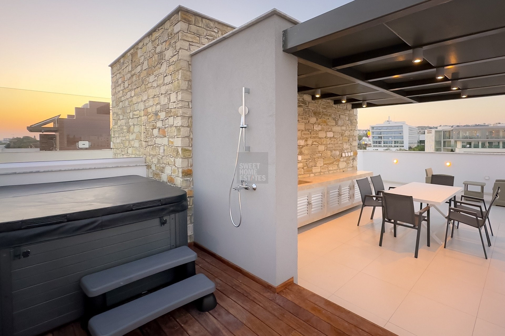 In addition to the living areas and kitchen on the ground floor, and the bedrooms on the first floor, the lower level offers space for recreation, a fourth bedroom, and a relaxing jacuzzi. Enjoy enchanting evenings beneath the stars on your private rooftop garden or in the garden by the pool, complete with a barbecue area.