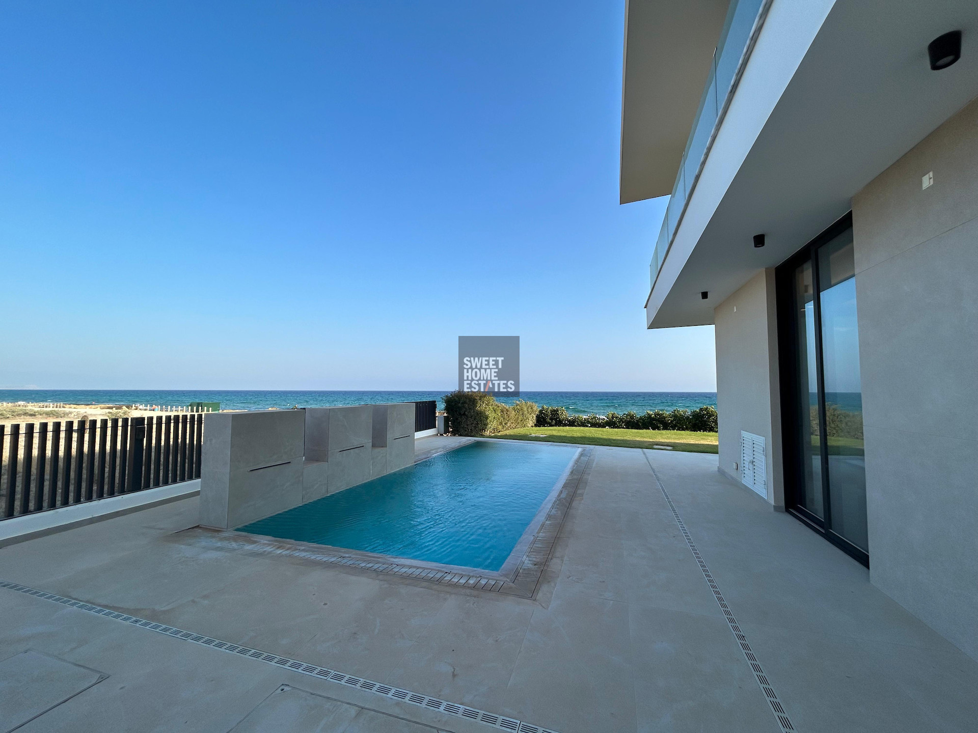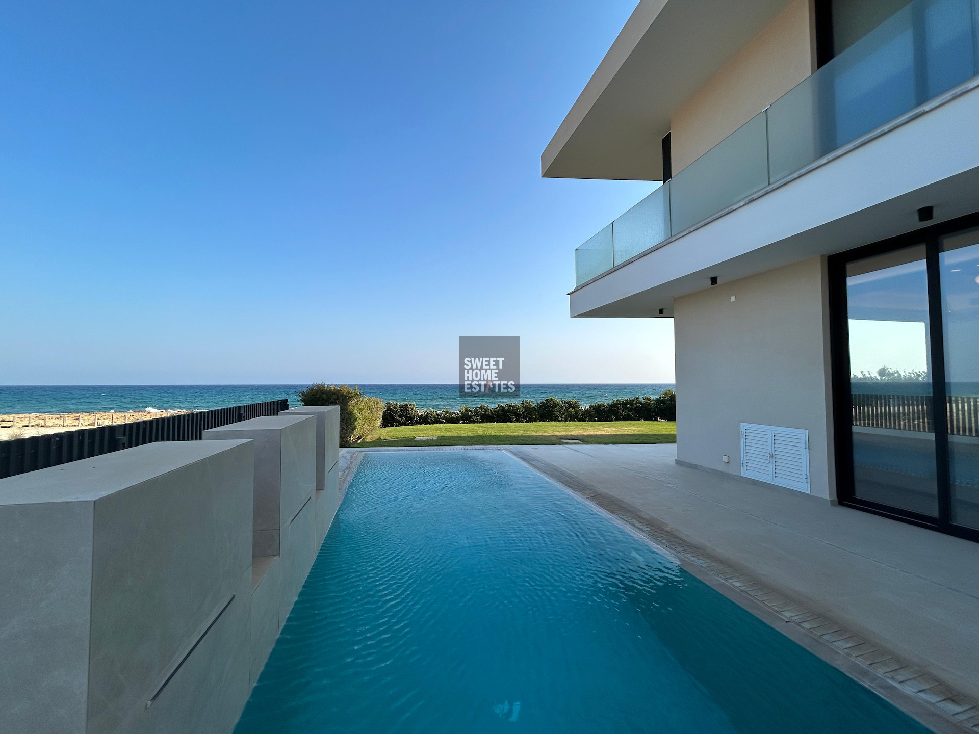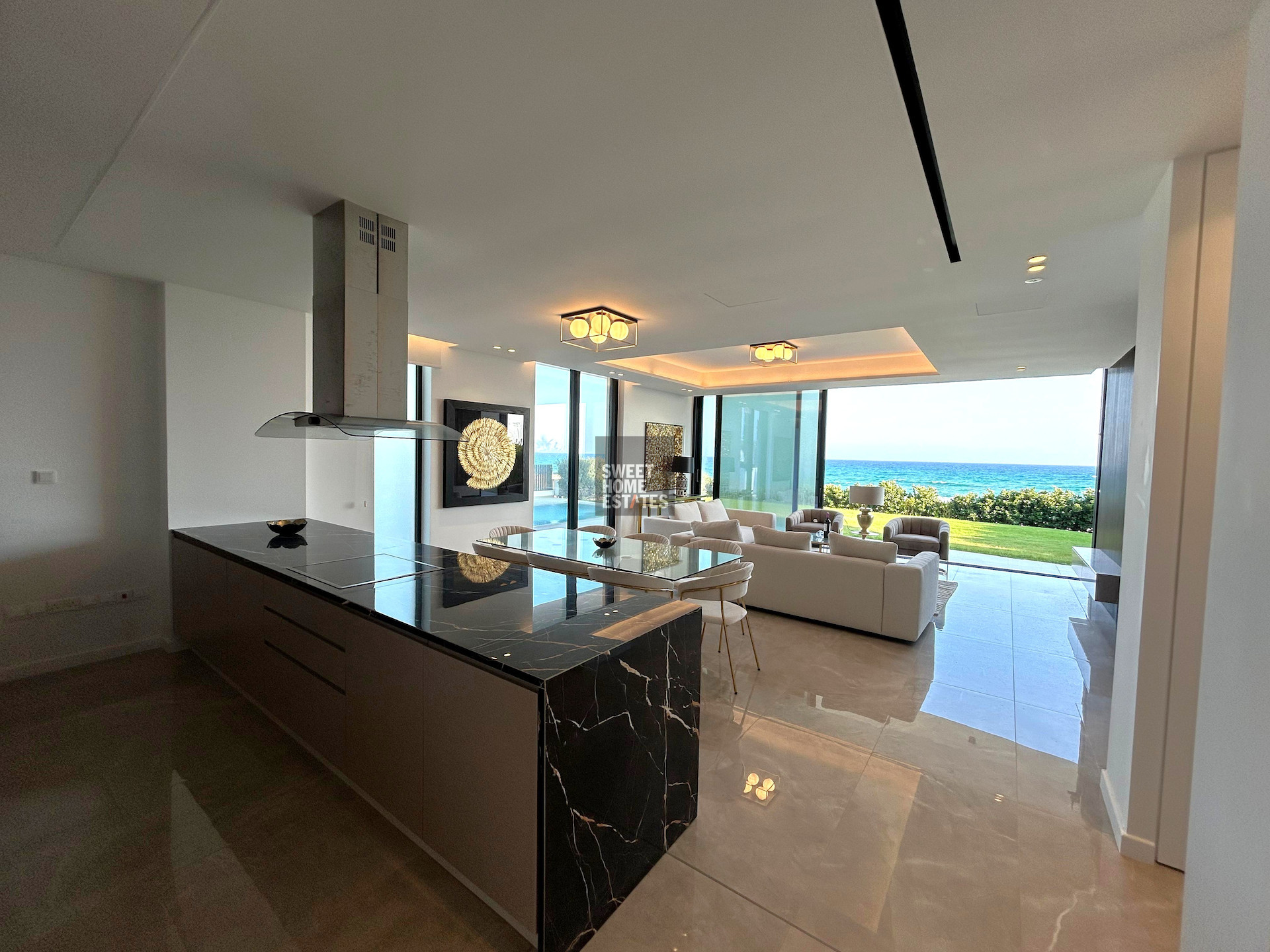 The villa enjoys unobstructed views of the Mediterranean and direct access to a stretch of soft sandy beach, where white sand and azure waters set an idyllic scene. A private overflow swimming pool forms the centerpiece of the outdoor space, inviting residents to unwind while gazing at the endless horizon.