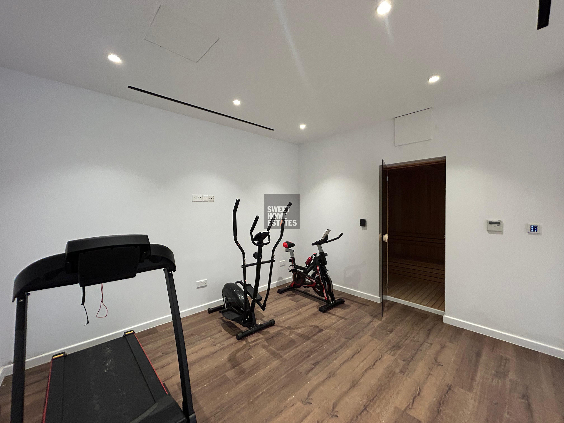 Inside, the villa has been thoughtfully designed to maximize light, space, and comfort. An open-plan living and dining area flows seamlessly to the terrace, while the modern Italian kitchen adds both style and functionality. The property also offers refined features such as a wine cellar, gym, sauna, private parking, central heating, and an elevator.