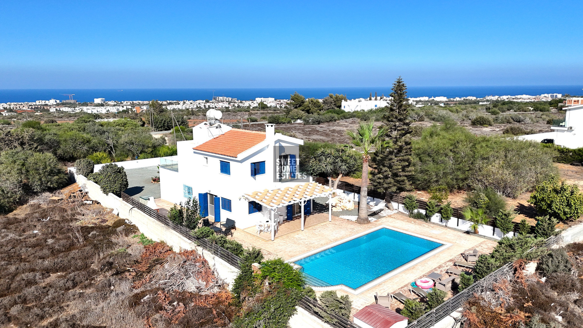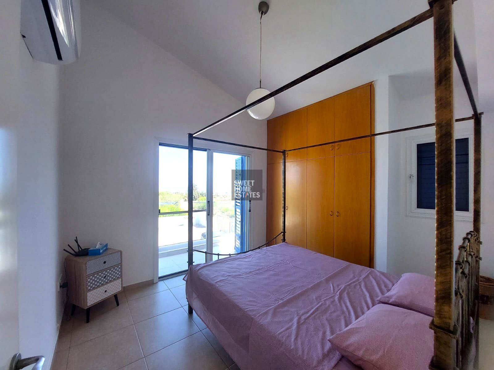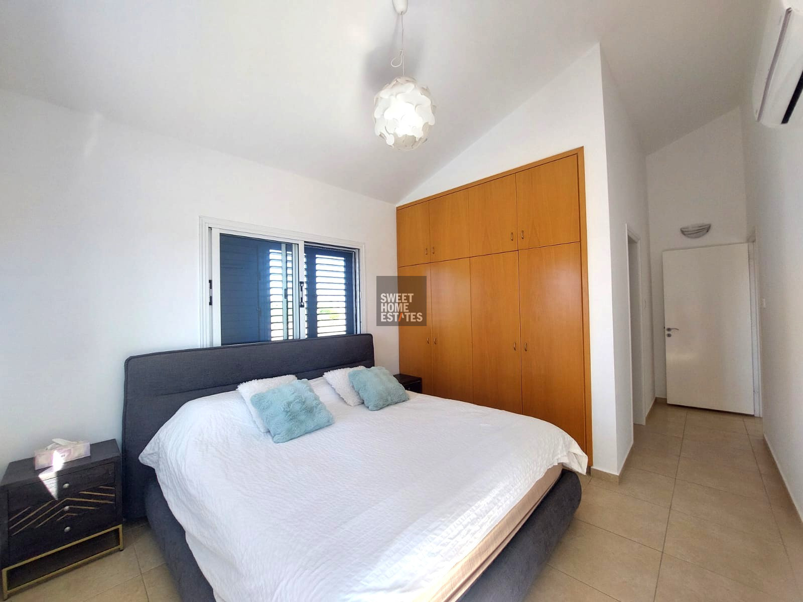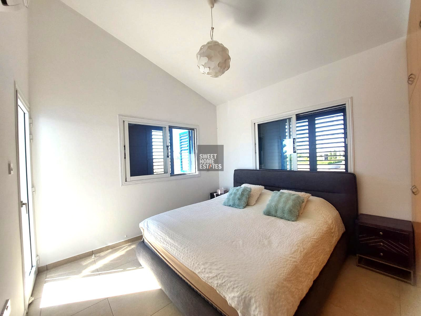 Upstairs, the master bedroom boasts en suite with a double shower. The two additional bedrooms are served by a large family bathroom, and each has its own private balcony—one overlooking the swimming pool, the other offering sweeping views of the Protaras coastline.