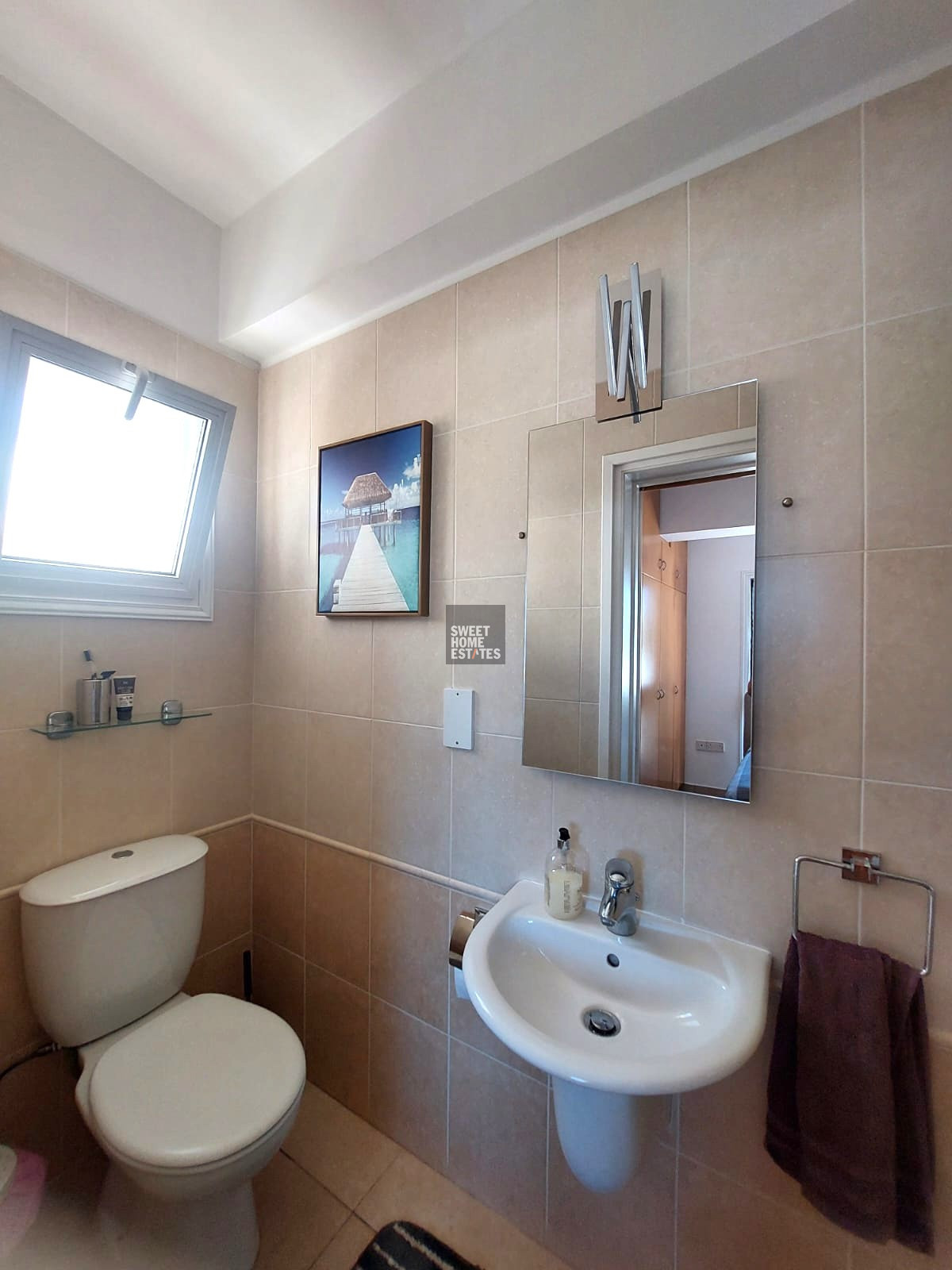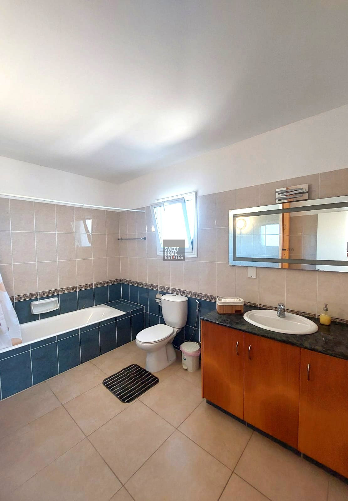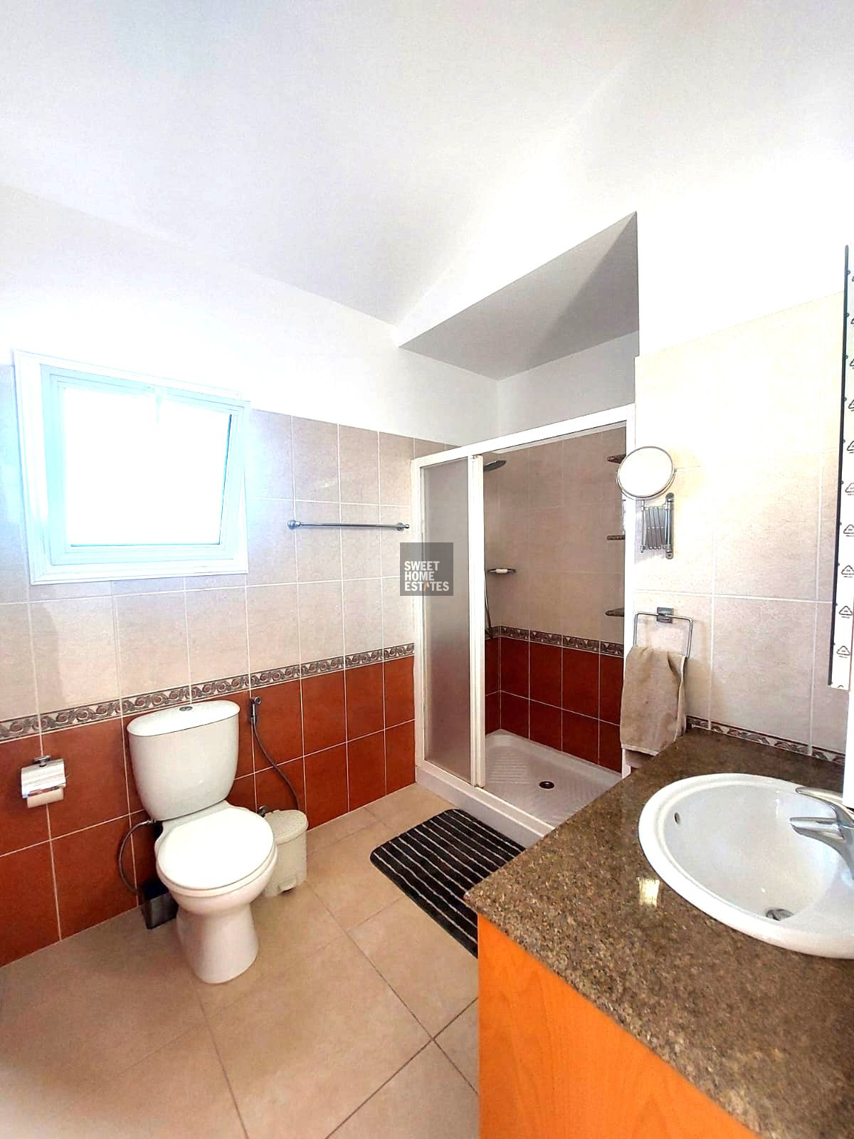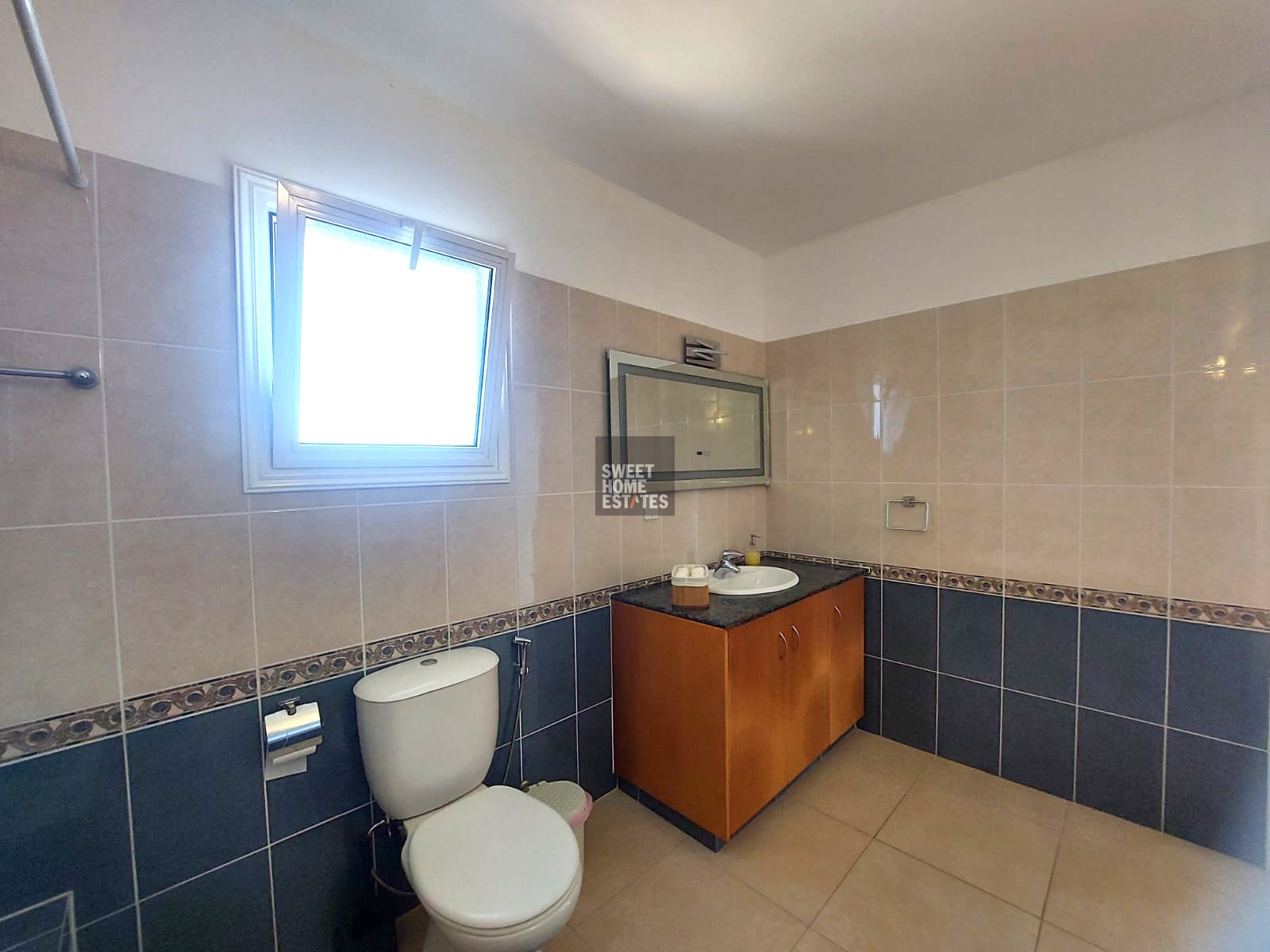 Upstairs, the master bedroom boasts en suite with a double shower. The two additional bedrooms are served by a large family bathroom, and each has its own private balcony—one overlooking the swimming pool, the other offering sweeping views of the Protaras coastline.