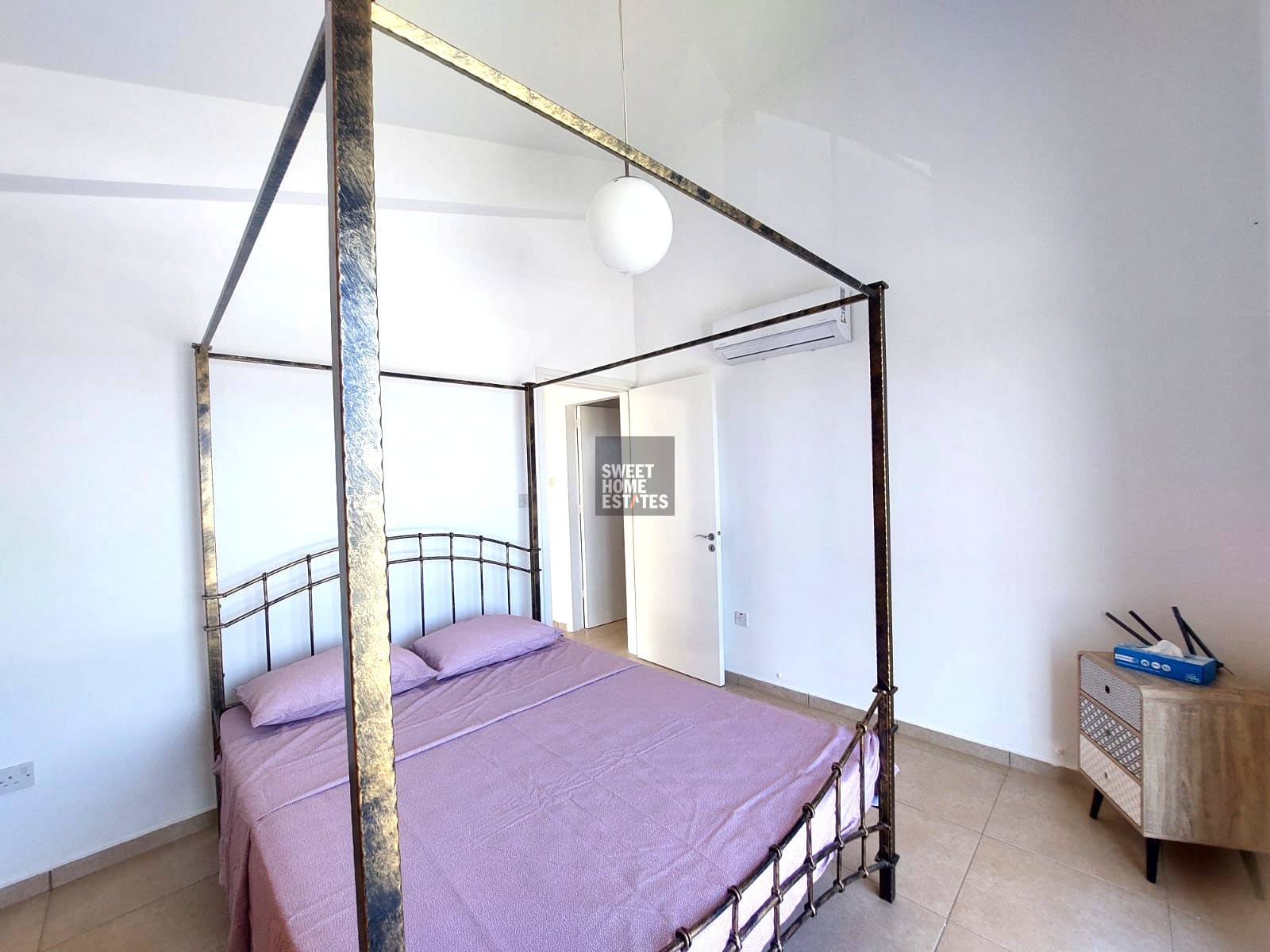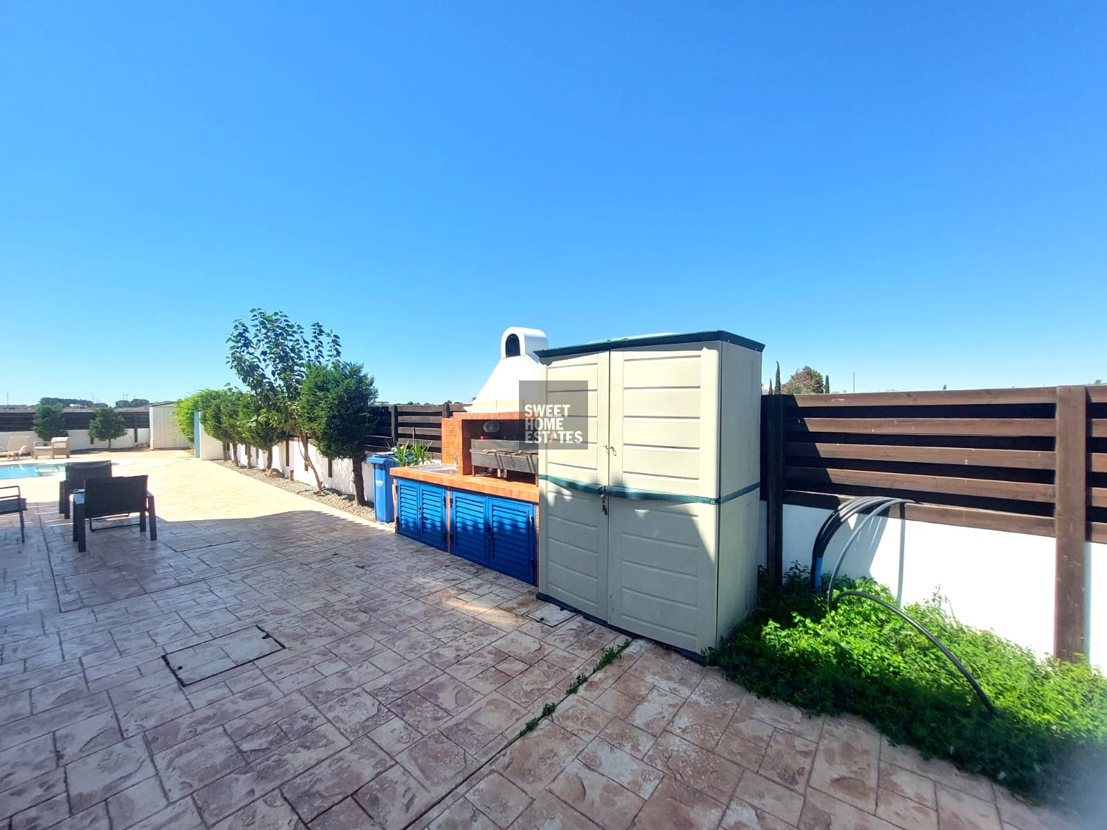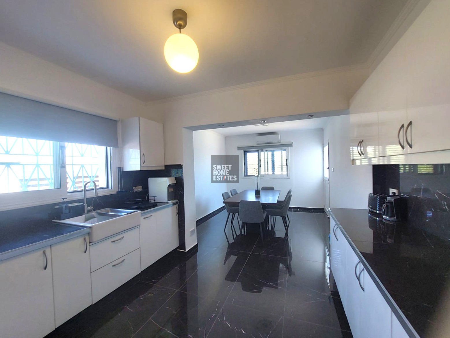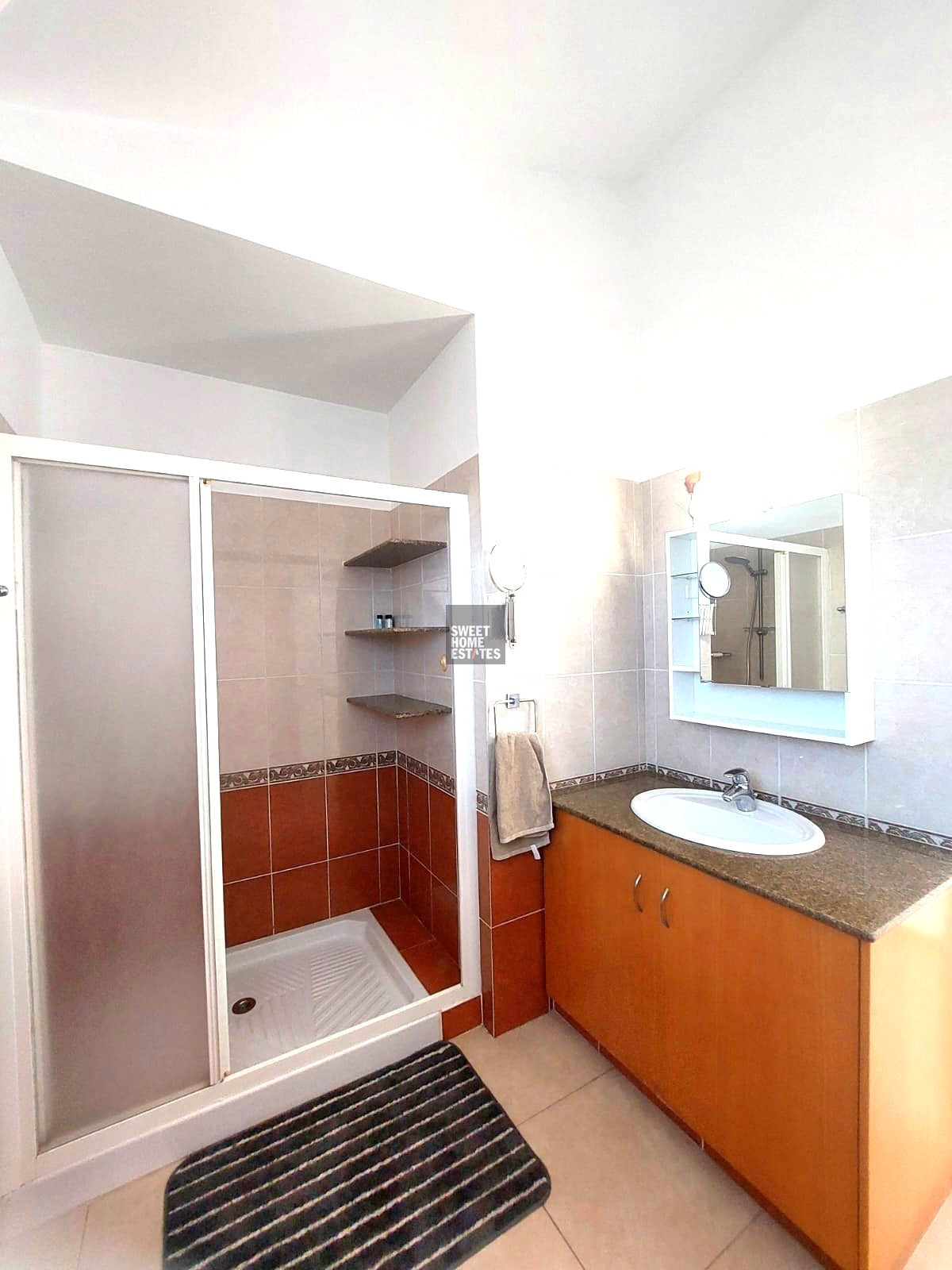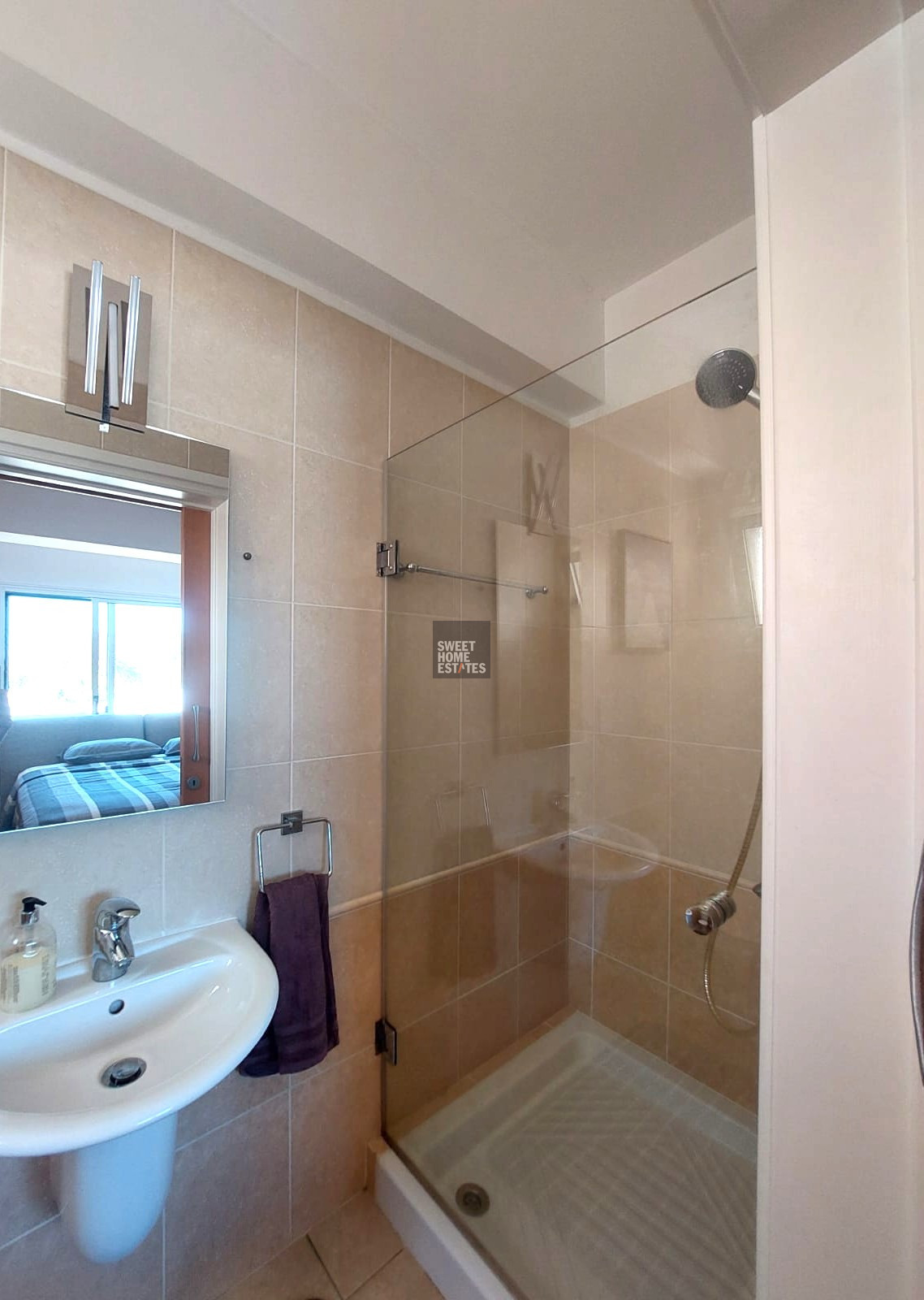 Upstairs, the master bedroom boasts en suite with a double shower. The two additional bedrooms are served by a large family bathroom, and each has its own private balcony—one overlooking the swimming pool, the other offering sweeping views of the Protaras coastline.