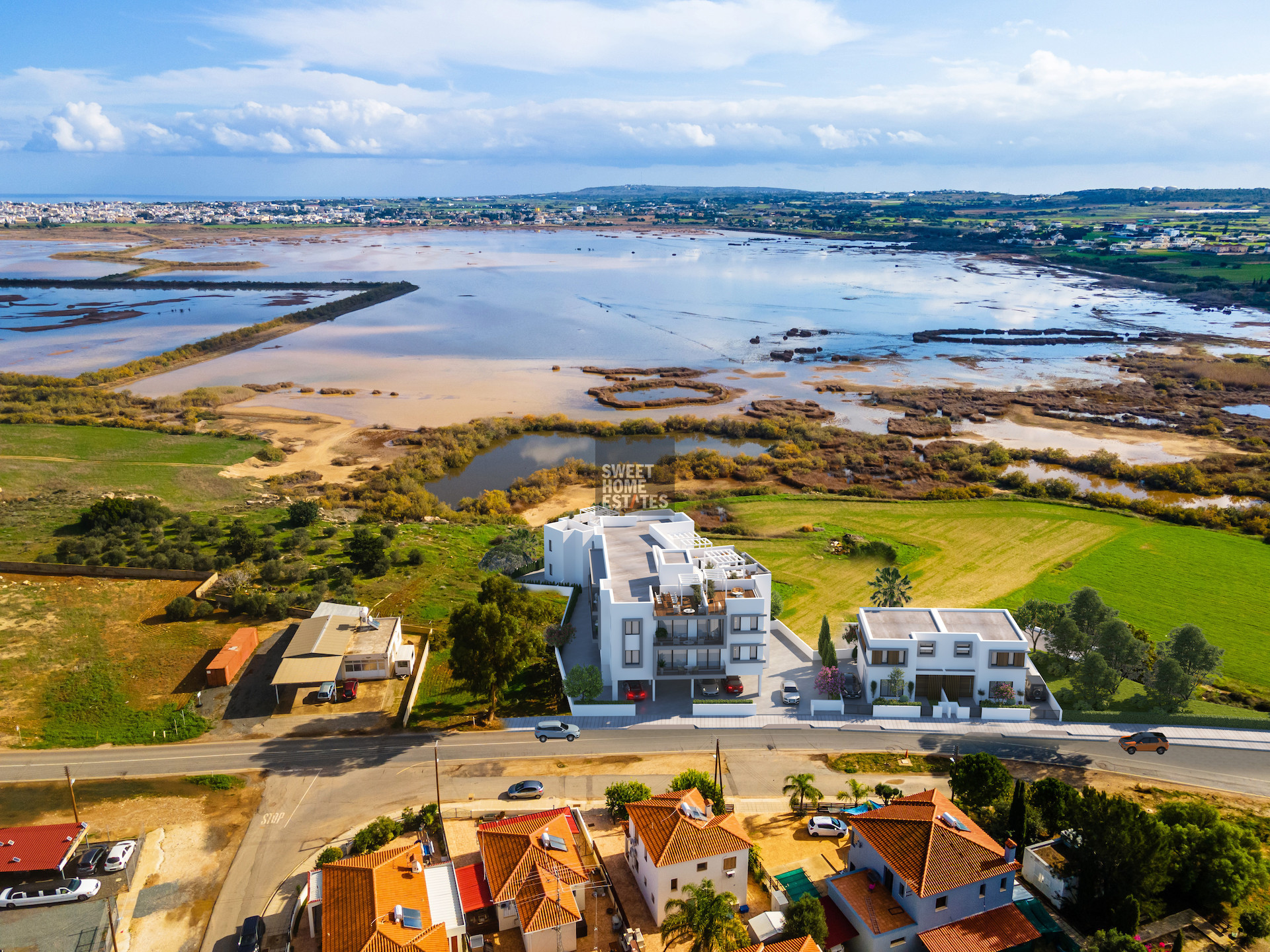 Designed with modern-inspired living in mind, the apartment features a stylish open-plan kitchen that flows seamlessly into a spacious living and dining area. Plenty of natural light fills the interior through double-glazed patio doors, which open directly onto a partly covered veranda boasting fabulous views across Paralimni Lake — an ideal setting to relax and enjoy the peaceful surroundings.