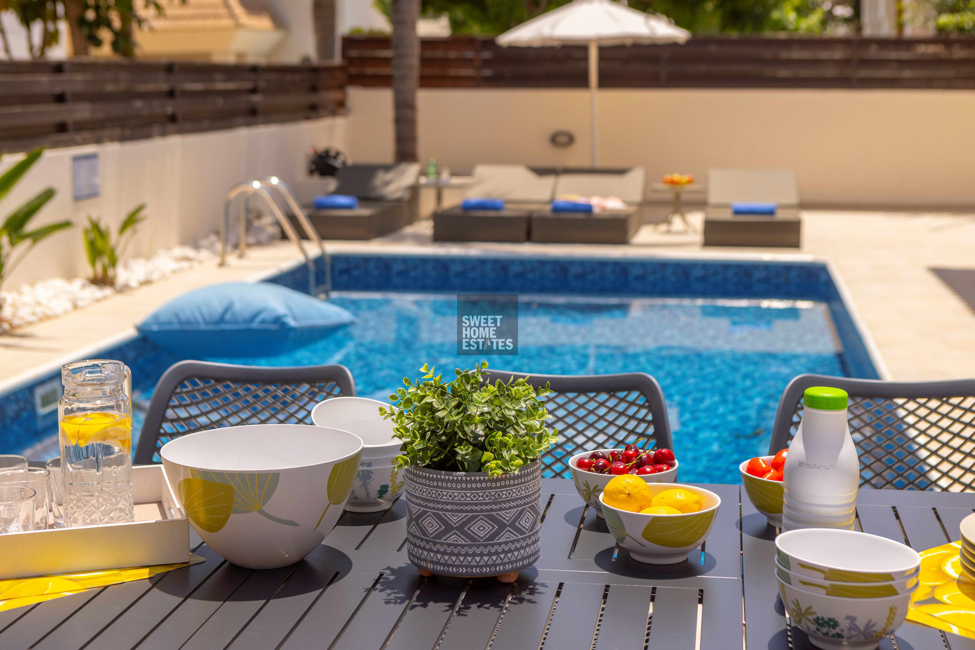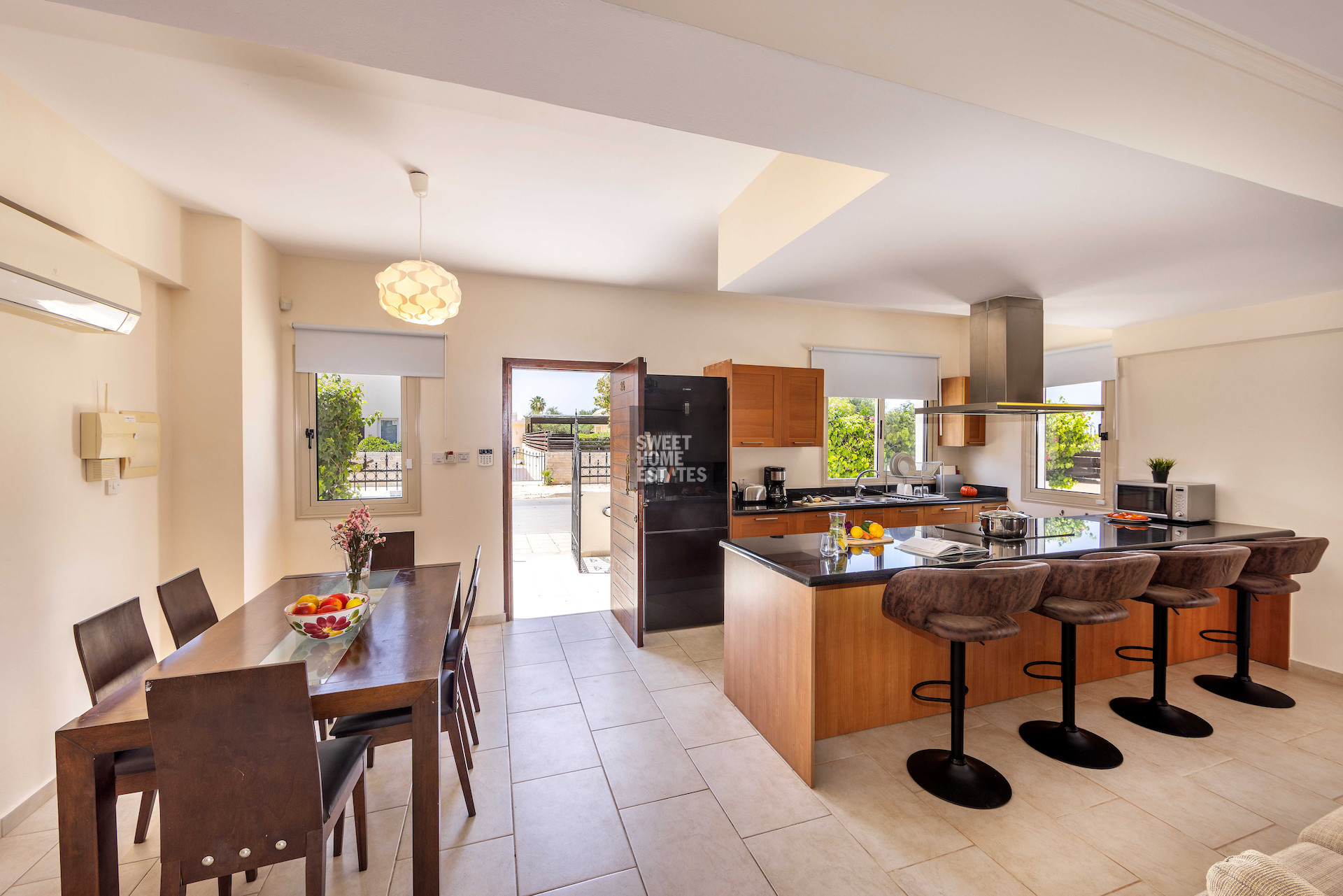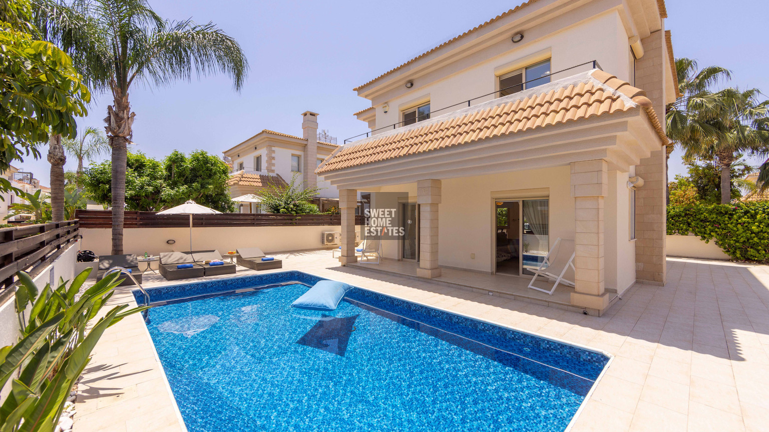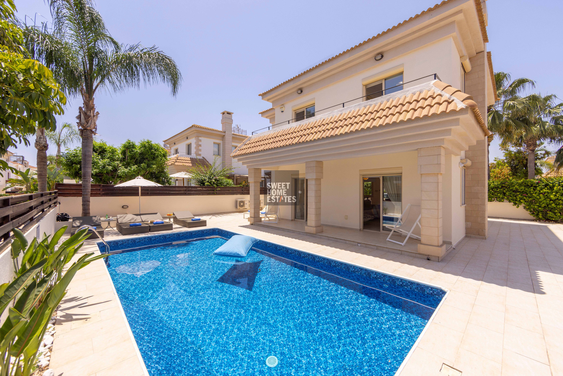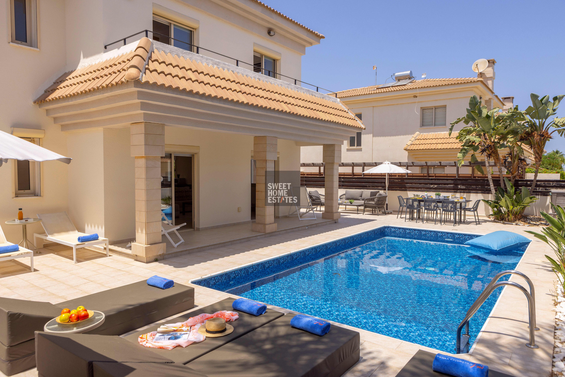 The home features three generous bedrooms and three bathrooms, ensuring both privacy and convenience for residents and guests. The open-plan living and dining area allows natural light to fill the space, while large windows offer lovely views of the sea. Step outside to your private swimming pool, perfect for relaxing or entertaining during the warm summer months.