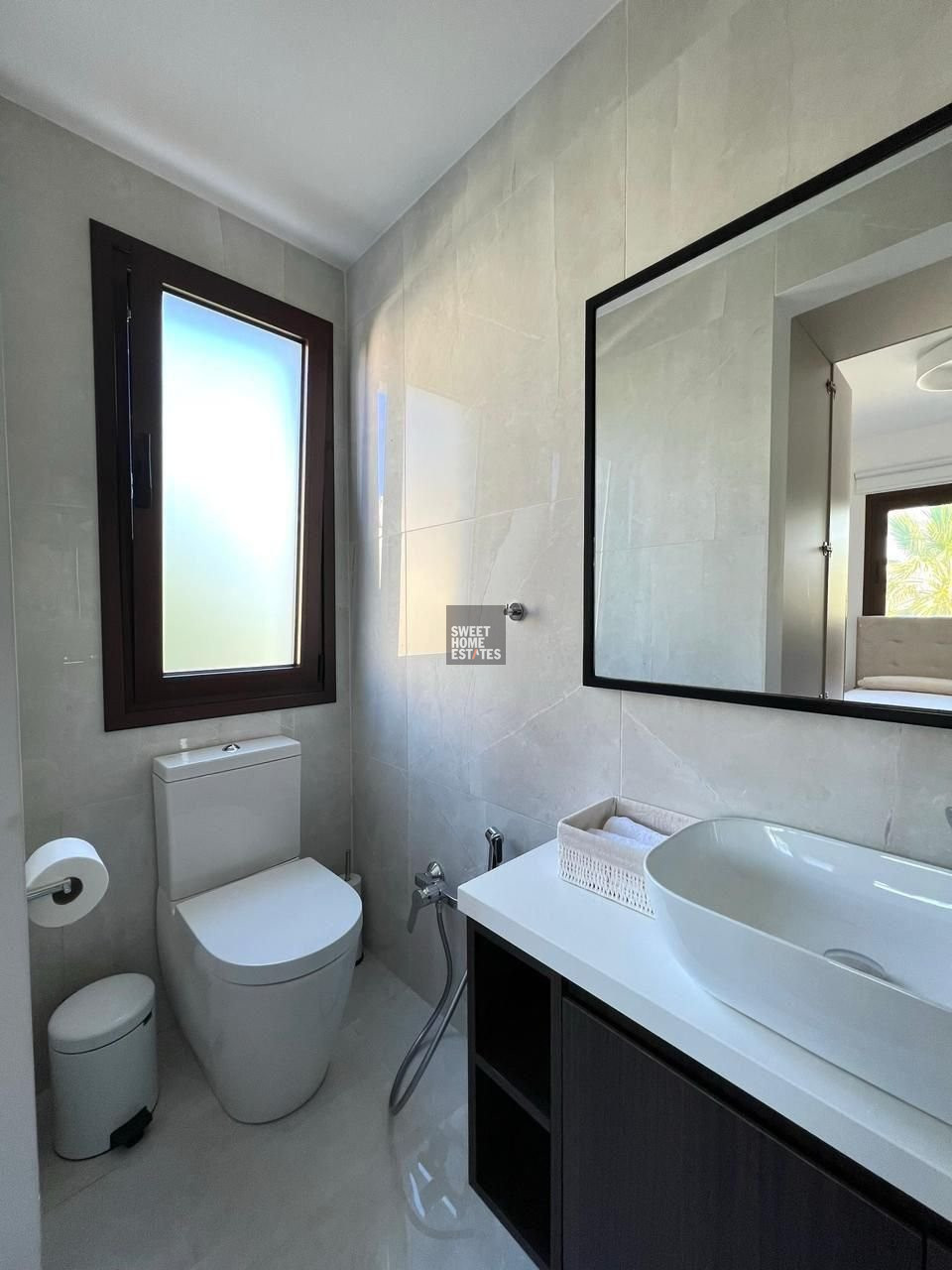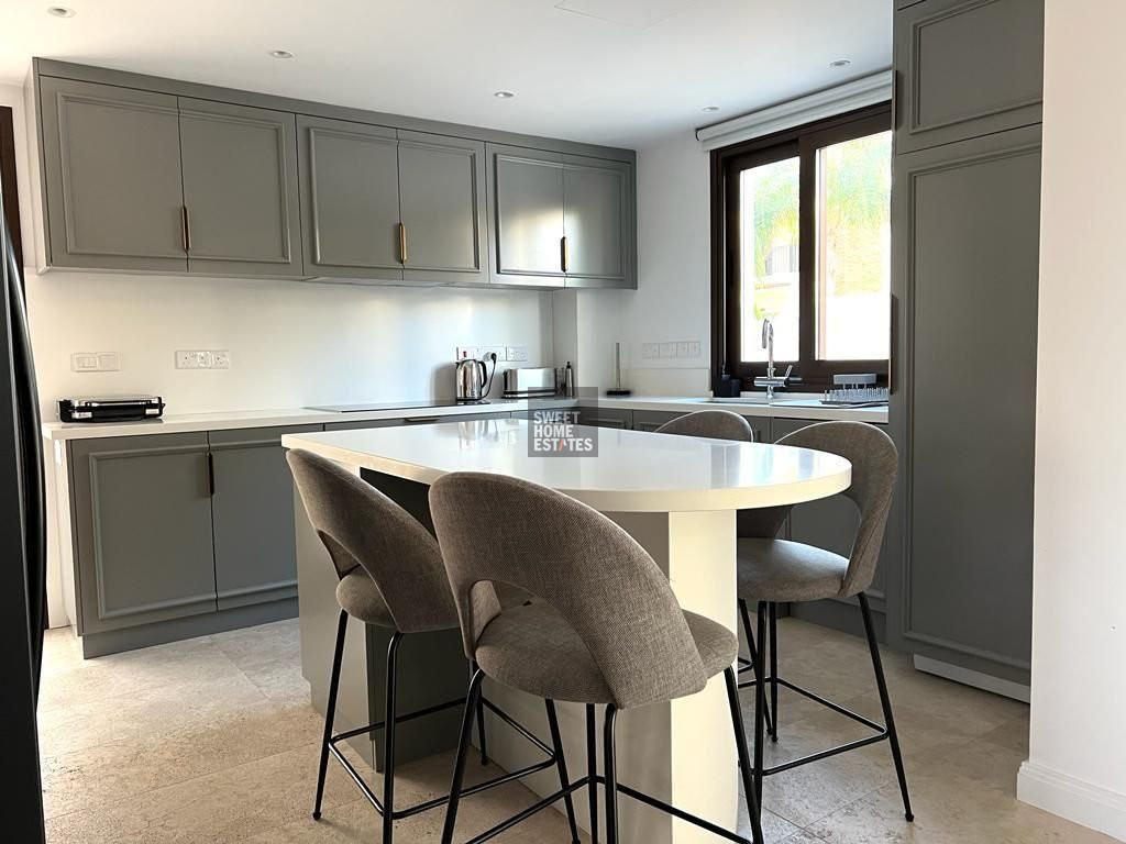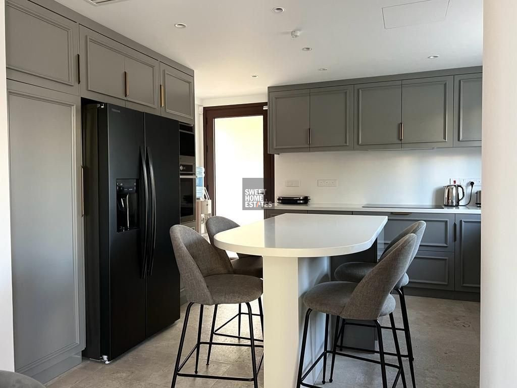 The villa features a bright and spacious open-plan living area with soaring ceilings and large double-glazed windows that flood the space with natural light. Electric shutters offer both convenience and privacy, while the covered terrace provides the perfect spot to relax and take in the stunning sea views all year round. The modern kitchen is fully equipped with high-end appliances, ample storage, and a central island with breakfast bar, perfectly positioned next to the dining area for effortless entertaining.