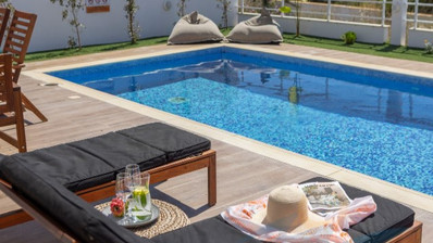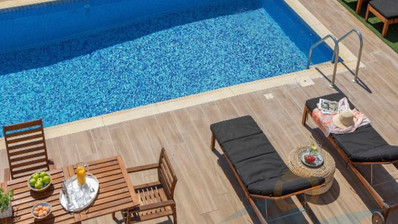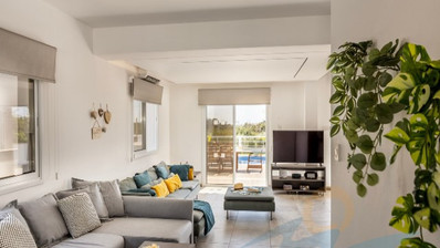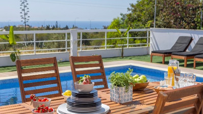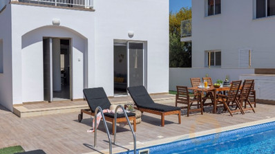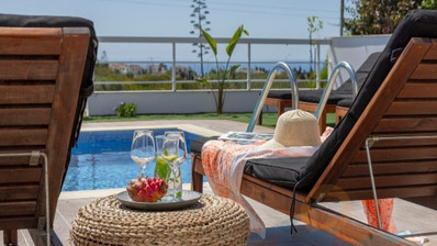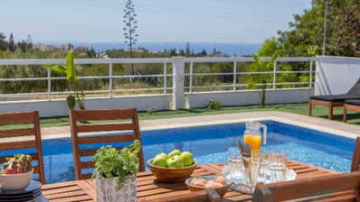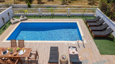 The home features three generous bedrooms and three bathrooms, ensuring both privacy and convenience for residents and guests. The open-plan living and dining area allows natural light to fill the space, while large windows offer lovely views of the sea. Step outside to your private swimming pool, perfect for relaxing or entertaining during the warm summer months.